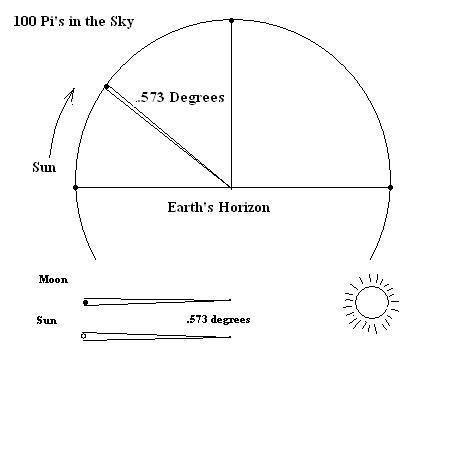 | David Jay Jordan's 100 Pi's in the SKY The Lord was the Creator of the macrocosm as well as the microcosm and made the exact diameters of the Sun and Moon and their distances from us as a SIGN of His power and DESIGN. SEE Who made the Distances and Magic Ratios So let's look at His Sun even as it represents the Son of God and its journey over us from horizon to horizon during the day, and see if there is any mathematical harmonic relationships involved ..... as Pi (3,14...) in the Sky. |