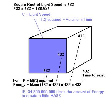 | Speed of Light and 432 Einstein's famous equation of energy and matter was written E=mc2 In other words, there is a connection between energy (spirit) and matter via light speed squared as c = light speed (SEE Flesh and Spirit Equation) Why because matter came from energy or SPIRIT. The Lord was the CREATOR from the Invisable Spirit World. From previous article at Light Speeed proves God's Design m = meter = 1/10,000,000 of the Earth's Circumference from Pole to Equator M= megameter or 10,000,000 meters c = speed of light = 299,792,000 m/sec d = s times t (distance equals speed multiplied by time) A.U. = Distance from Earth to Sun *************************************************** m = c(sec)/299,792,000 Therefore m= 1/10,000,000 of Earth's 1/4 Circumference = c(sec)/299,792,000 Do you see the relationship between the Earth and the Speed of Light and then when you add in the equation of the Parthenon and the Speed of Light , and the equation from the LIX NUMBER at http://www.klatu.com/lix/index.html you get .... c = phi (M) (600')/seconds c = (A.U.)/500seconds = 4.9' x M (10,000) = phi ' x (M) (100,000) (Notice how 500 seconds relates exactly to the Time for light speed to reach Earth - Tabernacle of the Sun - as well as the height of Giza and the Cydonia Mound) Therefore Light Speed and Phi are intimately related and that with the Distance between the Earth and the Sun. Because "Light Speed is measured in Earth seconds and the mean distance of the Earth from the Sun is a function of the Golden Section and the number 33". SEE Absolute 33 and Speed of Light, 33 and Phi connections Following from ..... This leads to one of the most profound instances of the occurrence of the number 432. In the equation, E= energy, m = matter, and c = the universal constant speed of light. The speed of light is generally accepted to be 186,291 miles per second in a vacuum. However, the square of the number 432 is 186,624. If the universal constant speed of light were in fact 186,624, then the number 432 would be the square root of the speed of light ..... Square of 432. Comment - Presume for a moment that you do not know the speed of light, but are aware of the equation E=mc2. An intuitive scientist who substituted the number 432 for "c" in the equation would be very close, if not precise, in the determination of this universal constant, that is, E=m(432)4. This illustrates the important concept of "reverse engineering" to find unknown quantities and constants by use of the cosmic number 432 and its multiples and divisors. Consequently if 432 is a distance of a side of a cube (or string distance that vibrates at a certain hertz) then a cube face would be equal to 432 x 432, which equals 186,642, close enough to be light speed because of the anomales of light speed. SEE hyper LINK below. Therefore it seems we can picture light speed as an, area of 432. (SEE graphics to the right coloured in blue) Yet to bring light speed (ENERGY) into MASS, light speed has to be be multiplied by itself...as E = M(C) 2 Hence visualizing this in 3 Demensions, gives us a Cube with 432 sides. And if we give it time to exist as its fourth demensionhe area of light speed could make a cube and to make it exist in time it makes it 4 demensional with another factor of 432. Consequently it takes a HUGE, HIGE amount of organized ENERGY or Spirit or Light to produce just a small amount of matter, and that is another reason why there has to be a Creator of Almighty, unexhaustable Energy to be able to creat mass, us and the Universe. And the major archetype of 432, and its corresponding vibrations and octaves and harmonics are KEY to being in tune with Him and His Creation. Don't you agree ? Still can't catch it, then consider the speed of light in a nanosecond, a billionth of a second ... it goes about about one foot. This because new research shows that light speed can be altered, at different temperatures and is not an absolute constant. Research News HERE ..... http://www.washingtonpost.com/wp-dyn/content/article/2007/01/18/AR2007011801683.html This is why the Creator could create beyond the speed of light in the Beginning. For when He placed the stars seemingly light years away in distance, they weren't because His Spirit is instaneous everywhere Then we can assume that light can travel exactly one foot per billionth of a second. A foot representing a human foot length, a span ..a human hand span, a cubit, three spans or one and a half feet, or length from our finger tips to elbow, means light speed itself is harmonized with our bodies and its measures. Are you catching it ? We are sacred and divinely created to be harmonic with light and the Sun, Moon and EARTH. Not by chance but by Design. (Consider Made in His Image and Phi design of the Human Body ) Sorry its true !!! Just be mathematical and accept it or be spiritual and accept it. |