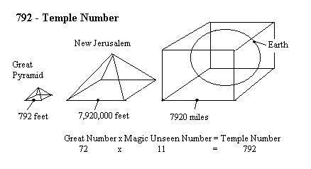 | David Jay Jordan Home Math Science Creation (Temple) Number - 792 Hear Oh Israel, The Lord Our God is ONE, (Deuterormy 6: 4)..... and He has 3 forms, Father, Son and Holy Spirit and these 3 are 1 (I John 5; 7) and form the TRINITY. And this equal Trinity of Power can be represented by an equilateral triangle inscribed with His Hebrew name, Yahweh. This can also be pronounced Jehovah, but is spelled Yod-He-Vau-He in Hebrew consonants. In triangular form, with the alphanumeric values of these letters in place, it adds up to His Great Number 72. And with His Great Number, the Lord created all things according to His Name and His WORD and words, by going from 1 an infinitely small, but infinitely large point, to a line between 2 points, to His Triangle of 3, to a square of 4 that can encompass a circle, to the Template of life at 5, to a Hexagram of electricity at 6... and so on .... But in this progression, it seems the Lord uses His Magical Unseen abilities of His Number 11 to magnify His Name of 72 to 792 72 x 11 = 792 As this factor is present in so many of His Created Temples, whether His GREAT PYRAMID at Giza, His Eternal Phi Pyramid of NEW JERUSALEM, or the great Central Home of the Universe, EARTH. The Lord is good, and His mathematical and creative feats are absolutely amazing and consistent. Don't you agree ? In His Service David |