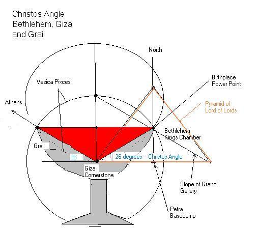 | David Jay Jordan's Great Pyramid Prophecy Christos Angle, Bethlehem, Great Pyramid, and Grail The Christos Angle, measured as the slope of the Ascending and Descending passageways of the Great Pyramid, is extremely important because it is also confirmed by the birthplace of the Messiah in Bethlehem. This because 'Jesus, the Creator' was born in Bethlehem as his prophets prophesied. And hence Bethlehem is situated edxactly at 26.3 degrees upwards and eastward of Giza, where the Lord placed his prophetic Great Pyramid. The Christos Angle slopes toward the King Chamber in the Pyramid and to the birthplace of the King of Kings in Bethlehem (SEE also the confirmation of Bethlehem's Latitude of 31.68 to the external circumference of the Great Pyramid (792 x 4 = 3168 HERE ) And it is for this reason, that it is said that the slope of the Grail is at 26.3 degrees, the elixir of transformation within, as His Blood is the only way for change and creation. In My Opinion David UNDER CONSTRUCTION... Write me with corrections and/or confirmations at [email protected] |
