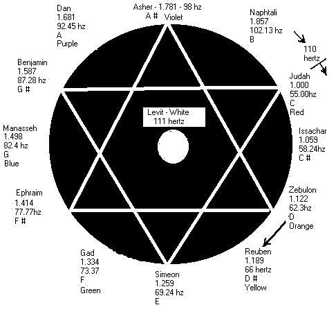 | David Jay Jordan's Home - Bible - Prophecy - Math - Music Musical, Colors of our Tribes in the End Time The LORD'S Harmonic Circle In the Tribulation just as in the First Exodus of the Children of Israel, we shall have the 'Ark and the Tabernacle' and circle around it in our respective Tribal origins. Everything being in order and everyone being in their proper Tribe. (SEE 144,000) So consider this possibility BELOW of how the Lord shall arrange us harmonically both in Tribes, as well as in light (Colors) and sound (Musical notes). His whole Encampment will be harmonically ONE in my opinion. And the Star of David or Seal of Solomon symbol, the two interlocking triangles, seems to be in fact the shape of this tribe placement by the Lord (SEE Graphics Here ) The Tribes of Israel as in the past, must circle around the tabernacle, the first tribe being Judah, towards the EAST. In an orderly fashin eash tribe finds its place and encamps under its Banner, Standard and Ensign. So after Judah comes ..... Issachar and Zebulun; Reuben, Simeon and Gad; Ephraim, Manasseh and Benjamin; Dan, Asher and lastly Naphtali. And yet spirally inwards we have the central pristly Tribe who was in charge of the tabernacle and its ministrations, the tribe of the Levites. |