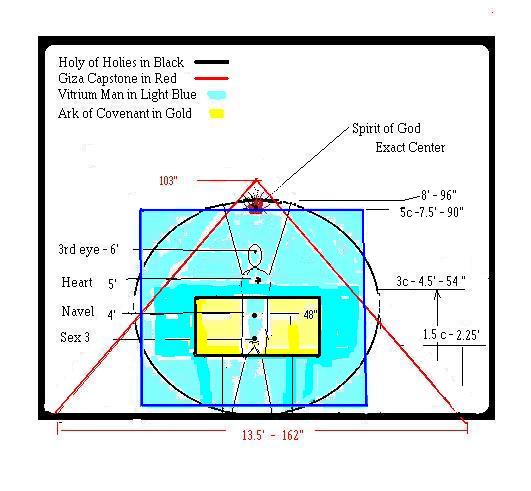 | David Jay Jordan's Vitrium Man inside the 'Holy of Holies' DaVinci, the Master, who was learned in the Mysteries, drew the perfectly proportioned man within a Circle. (See Vitruvious Graphics to the lower right). This circle being the same circumference as the square. This solving the puzzle of the squared circle, because with the side of the square as 1, its circumference is 4 and equal to the circumference a circle whose diamter is the square root of phi, or 1.272.(Phi being 1.618) SEE Phi Graphics and Mystery of the Squared Circle For as you may know, Giza is phi-templated as well. This meaning, its height is the square root of phi (1.272), because its sides are 2. So with a Base of 792' gives height its height at 504'. And now if we put 'man' and this sacred geomtery together inside the King's Chamber of Giza, you have a 'man' who is phi proportioned inside the phi proportioned Pyramid. And by its very divine nature and physics of proportions and alignment, the pyramid can 'Project to the Stars' which is why the Egfyptians tried to project their Pharoahs and initiates to the heavenlies and into the spirit world. However, the Egyptians didn't think up their knowledge, but it was given them via the angels straight from the Lord of Lords, He being the Great Designer and Mathematician who created all things. (SEE Stolen Information and Creation versus Evolution) And His original temple was the secretive and sacred 'Holy of Holies' a perfect cube incorporated into His Tabernacle. It's measurements as given to his man, Moses were 10 cubits, by 10 cubits, by 10 cubits. And what was a cubit, but again the measure of a man, the distance from his elblow to his finger tips. A cubit being 18 inches, which is two spans. A span being the span of a man's hand 9 inches. In other words, The Holy of Holies, was in correspondance to the greatest creation of the Lord .... MAN. Why, because we, whether male or female are 'Made in His Image' For, what was inside the Holy of Holies that had no outside light source ? ... the ARK of the Covenant, where the Lord decreed that His Commandments, His WORD was to be stored. Its measurements being 1.5 cubits by 1.5 cubits by 2.5 cubits, And there again, it is for this reason, that the Egyptians used the Lord's sacred measurements of His Ark in designing their 'sacrophagus' within their King's Chamber, and made their ark or sacrophagus exactly the same size. IE, The proportions or ratios matched up with the harmony of all worlds whether in the macro or micro-cosm. Are you catching it the reasoning ? ( SEE Ark and Sarcophagus). And what was above the ARK, that gave light to the Holy of Holies ? ... the Spirit of the Lord via His FLAME, It's light being between the two covering cheribiums placed upon the ARK, right in the very exact center of the Lord's Divine Cube. (SEE Exodus 25) But wasn't the power of the Great Pyramid of Giza, suppose to originate from its 'Capstone' that was never placed on its apex. Wasn't this the stone which the 'Builders' rejected, and that stone or capstone being JESUS. The capstone measurements being given as 13.5 feet on each side of its base, with aheight of 103 inches. SEE Capstone and 1/56 Pyramid mathematics) Consequently we can add these ingredients to this mystery together, to possibly solve why and how man fits into the Lord's perfect proportions. Let's put a 6 foot 4inch man inside the Holy of Holies, which also shows the Ark and the Capstone all inclusive. So if you are interested enough to go on ....... to how Man fits into the Lord's design and into the Holy of Holies proceed further to Part TWO ....... of Man in the Holy of Holies |