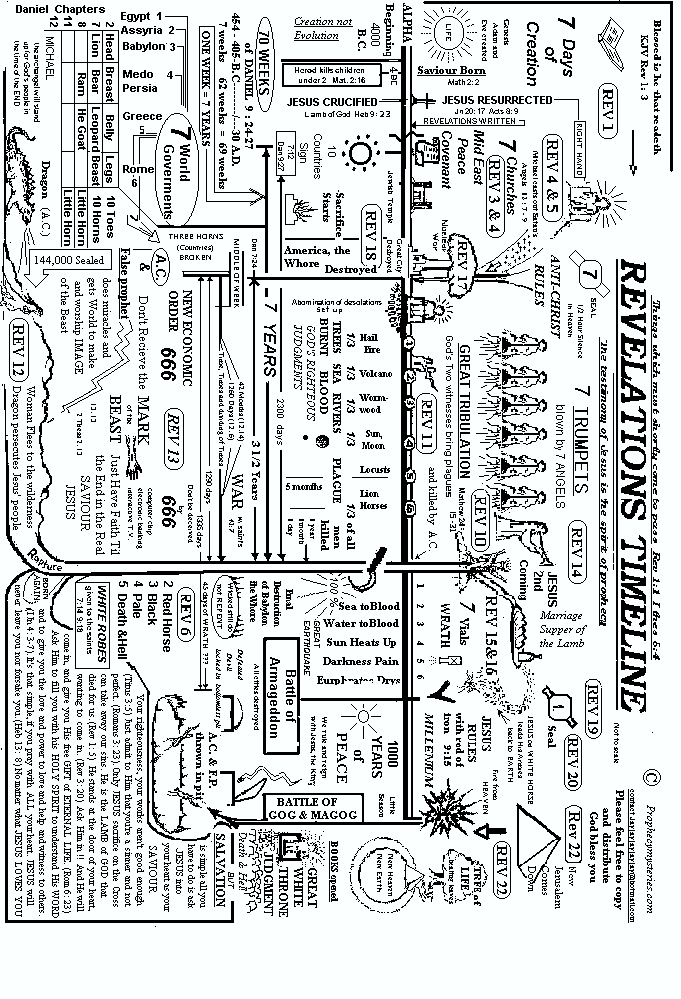 | REVELATIONS TIMELINE Check out the details of the above Revelation Outline, and if you think its true, feel free to pass it out to others. The formatting is such that it should fit on an 8 x 11 print out. All the best to you and all of us in understanding the Lord's Prophecy. Sincerely David Jay Jordan and Joy ************************************** |