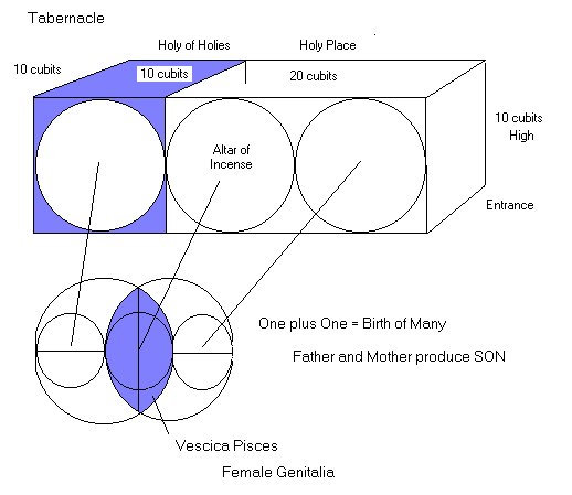 | For as can be seen, the proportions of the Tabernacle correspond to the classic and basic formation of the Vescica Pisces, (in blue above ). This is how the two mated circles form the third.circle, or how the Two making love make the MANY. For it is from this Vescica Pisces, in sacred geometry that the many are born. In Christianity, it is how the Father and Mother ( God and the Holy Spirit ) created all creation. And sexually, it is easy to notice that the Vescica Pisces corresponds to the 'female genitalia' for out of her portal of love is born 'new life' |