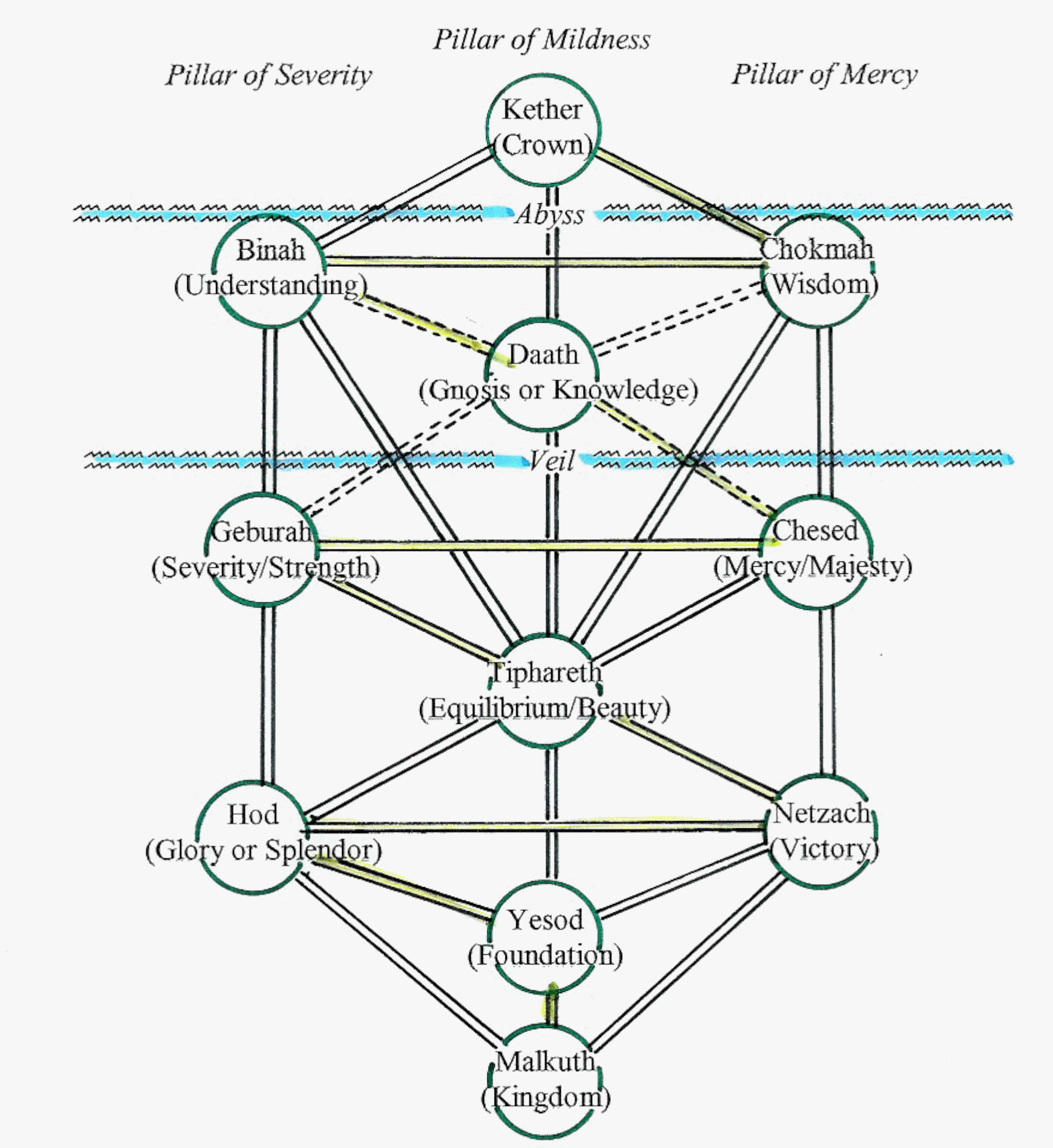 | David Jay Jordan's Heavenly Mysteries - Math - Phi - Prophecy ' Tree of Life' - Kabbalah The Kabbalab, was and is nothing more than what the Lord taught Moses on Mount Sinai. ""And the LORD said unto Moses, Is the LORD'S hand waxed short? thou shalt see now whether my word shall come to pass unto thee or not. And Moses went out, and told the people the words of the LORD, and gathered the seventy men of the elders of the people, and set them round about the tabernacle. And the LORD came down in a cloud, and spake unto him, and took of the spirit that was] upon him, and gave it unto the seventy elders: and it came to pass, that, when the spirit rested upon them, they prophesied, and did not cease. (Numbers 11: 23-25)."" Moses was up on the Mount for more than eighty days, and so there is so much more than the mere 'Ten Comamndments' that were handed down to him. But he was instructed to only pass the Kabbalah along to the seventy elders of Israel. These were called the Sanhedrin .... 70 members, with one leader. Moses could just not do everything. The burden of leadership was just too much for Moses alone and so the Lord gave His Spirit of Wisdom and Understanding to 70 more leaders of Israel and they also prophesied, and took a share of the leadership responsibilities. The Kabballah, no matter how it is spelled whether Cabala, Qaballah, Qabala, Kabala or Kaballah, just means the'oral tradition'. And it's truths are based on the original Tree of Life, that was in the literal Garden of Eden.""And the LORD God planted a garden eastward in Eden; and there he put the man whom he had formed. And out of the ground made the LORD God to grow every tree that is pleasant to the sight, and good for food. (Genesis 2 :8-9)"" Later the Kabbalah, was put in written form and much much later on in the Book of Creations, Book of Spendour and others... And hence now we are able to glean some of these previously hidden truths from these books.. SEE Background website at http://www.digital-brilliance.com/kab/faq.htm . But what we have to remember is that the Jewish religion has taken some of these truths and deemed them their own, when in fact they are for us Christians. Moses was a prophet of the Messiah to come which was and is JESUS. and knew that there would be a split in the 'Children of Israel' ... as his prophecies declared. A physical unbelieveing scion or branch and a believing remnant. SEE Moses Two Israel's Prophecy Therefore we, Christians have the right and ability to learn these basics of the Kabballah for ourselves to further strengthen our Christian FAITH. WHY, because the Kabballah was ultimately a sacred means of approaching the LORD through knowledge and understanding of His Nature as illustrated in the 'Tree of Life'. And with this knowledge and UNION with HIM/HER, we could become One and prophesy with His WORD. In other words, it is a divine means, so we can come before His Throne, to hear from the King of Kings... JESUS. This the Jews can no longer achieve because they have rejected the Messiah that has come, and consequently have no power to prophesy. For you see, if there is anything the Kabballah instills in you, it is the absolute POWER of the Lord to have been the CREATOR and DESIGNER of all worlds. It shows how the visable came from the invisable. The Graphical 'Tree of Life' was and is composed of 10 Spheres, and 22 pathways between them. 10 representing our number base (SEE Math Mysteries) and Graphics below ..., Proceed to conclusion ..... TREE OF LIFE PART TWO IHS ...David SEE also Jachim and Boaz Pillars Kaballah and Templar's Chartres Temple Sacred Achitecture and Sex |