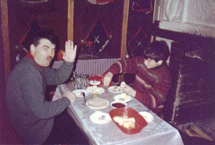 The "hotel" was really a five-bedroom cabin. But there was a fine view out my window my bedroom was nicely heated, there was hot water (which apparently not all hotels have) for a shower in my private bathroom (also not to be assumed), and they served three fine meals a day. The Georgian meal schedule is not the same as the American one. Breakfast was at 10:00, Dinner (the big meal) at 5:00 and supper at 9:00 or later. The meals were not fancy, though dinners were very good. The Shiskabab (mtskvadi) was especially good. My hosts complained that I didn't drink enough vodka. Every couple of minutes somebody would propose a toast and they would empty their glasses and I would take another sip.