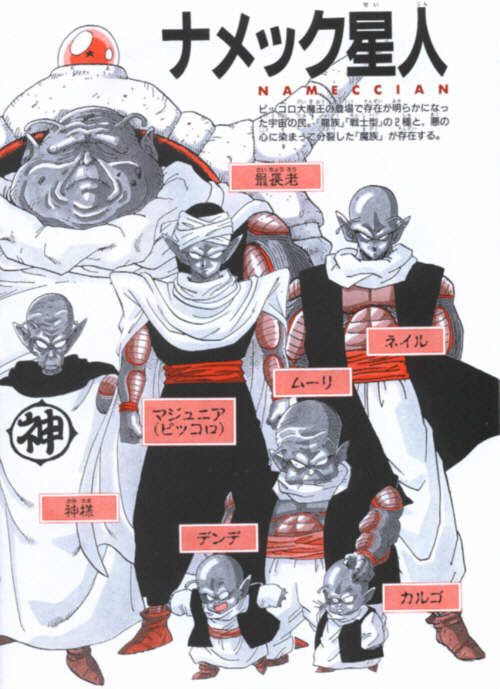 Are the race that created the Dragonballs. These green aliens are a peaceful race and are mostly healers, with a few warriors (though they are rare). The Nameks have the ability to regenerate any part of their body, except their head. Though this causes an emmense amount of pain. Nameks also have the ability to stretch out their limbs. Some Nameks (like Slug) have been able to expan their entire body, making them grow to massive sizes.
