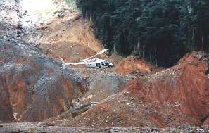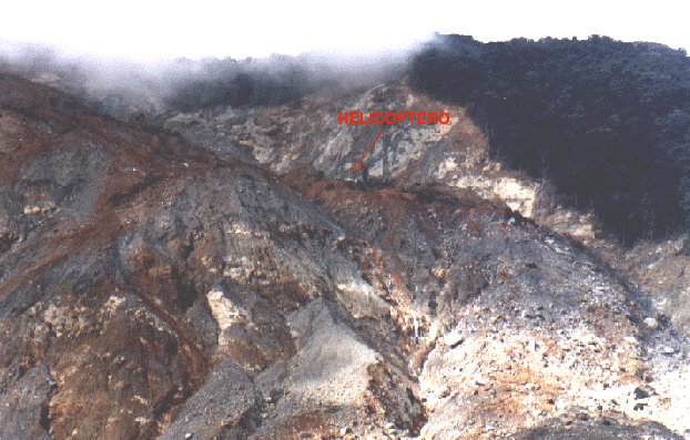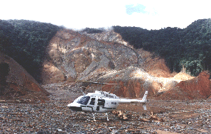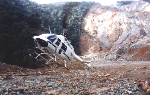 Se observa una línea recta a lo largo del cerro donde se ven arboles y luego la roca lavada, es como dijo uno de los pilotos; "Parece como que una manguera gigante de alta presión hubiera apuntado su chorro contra el suelo", lo referido se observan en estas fotos, para dar una idea de la magnitud vean la última foto al centro de la misma al helicóptero posado casi no se ve y el aérea de desolación a su alrededor.