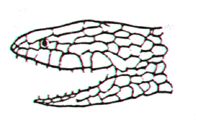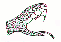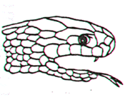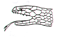 CABEZA GRANDE CON CUELLO DEFINIDO Y OJOS GRANDES, LOS ANILLOS NO RODEAN EL CUERPO COMPLETAMENTE, VIENTRE BLANCO
