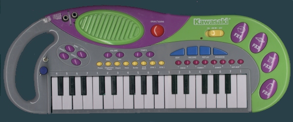 This is your standard black blob Kawasaki keyboard. It has 8 voice selections, 8 rhythm selections, a couple of demos, 4 percussion/sound fx buttons, 32 keys, and record/playback functionality.