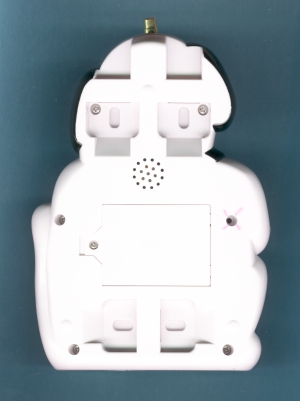 This was my second attempt at circuit bending. I picked this toy up at the OSU campus area Goodwill store (is it a Goodwill???) as well as a Kawasaki keyboard (featured elsewhere on this site) and a LeapFrog Express train (which is still to this day refusing to be bent). This is a black blob, so the only thing that I added was a pair of 'brass knuckle' body contacts that speed up the music and an RCA audio out. I was very happy with where I mounted the body contacts and the way this one came together. I had to cut out a spot where one of the securing screws was (in the hand) in order to mount the body contacts, but you can't tell at all so it's no big deal. I also like how the audio out comes out of the top of his head, like a little alien antennae.