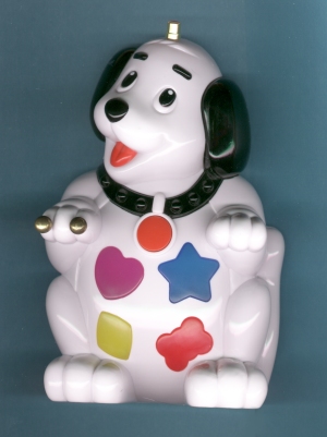 Press the red button on his collar and he plays a little tune like 'Twinkle Twinkle Little Star', etc. While the music plays, four lights blink in sequence, not necessarily to the beat of the song. The lights pretty much do their own thing.