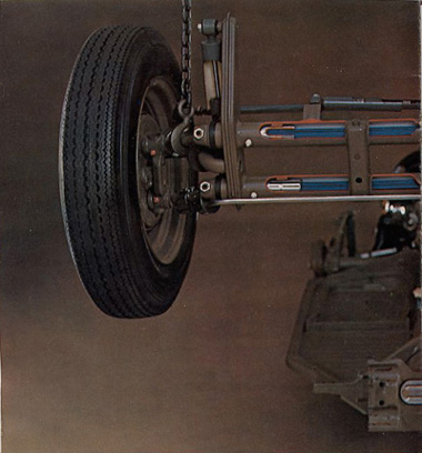 individually. Here, you see a picture of the front two wheels, along with the front two tempered steel torsion bars. We build each of the front torsion bars with 8 laminated leaves. We use round, solid-steel bars for the back wheels. |