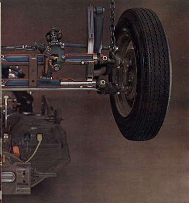 As the VW's wheels move up and down over a bump, each torsion bar twists independently and snaps back quickly to its original shape. (It's just as if you twisted a slat on a metal Venetian blind.) As the torsion bars flex, they unleash their springing power to the wheels. This lets each wheel follow the contour of the road independently. | Also since we make the VW's steering independent of its suspension, road jolts cannot be transmitted to the steering wheel; the wheels can't be jarred off course. | The result is an unusually comfortable ride. Without jolting or bouncing or sliding in your seat. With unusually good control over the roughest roads. |