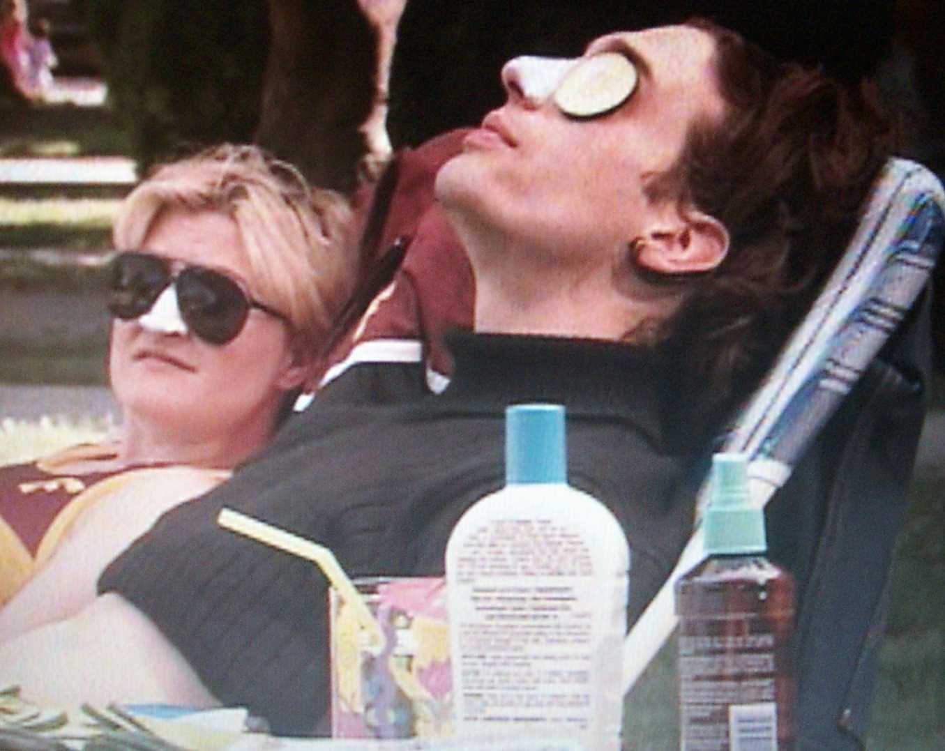 | Trying to get a tan and putting those cucumbers from lunch to use. |