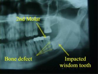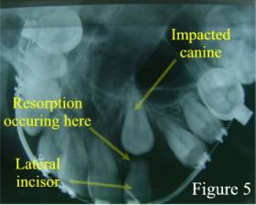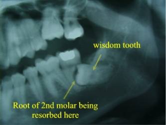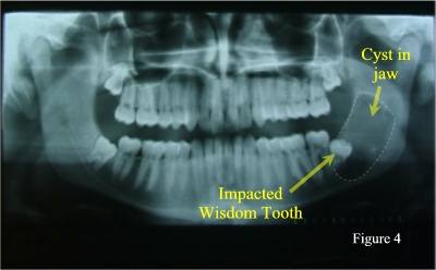 Alternativley, impacted or malpositioned wisdom teeth can cause a painful jaw infection with facial swelling, jaw stiffness and pus drainage. Waiting until pain or infection occurs, can result in irreversible damage to adjacent teeth, gum, and the tooth-supporting bone of the jaw. This is why it is often suggested to have wisdom teeth removed early before these events occur. As well, early removal in younger patients can result in more complete healing of any damaged tissues afterwards as compared to removal when patients are older. Still in other cases, malpositioned or impacted wisdom teeth can cause pain, swelling, jaw stiffness, and pus drainage right from the time they begin to erupt from under the gum and into the mouth. These teeth are also more likely to have cavities in them, which can eventually lead to an ‘abscessed wisdom tooth’. Click here to see other pictures of impacted teeth and the problems they can cause. Finally, in rare cases, an impacted wisdom tooth can develop a dental cyst or dental tumour around itself (figure 4). ![]() Impacted Canine Resorbing Lateral Incisor ![]() Also, be aware that wisdom teeth aren’t the only teeth that can become impacted. Other teeth in the mouth can also become impacted and cause dental disease (figure 5). These teeth will require extraction as well. The Final Decision About Your Wisdom Tooth Extractions At your wisdom tooth consultation appointment, you will be assessed for the need of extraction on an individual basis and an individual treatment plan will be suggested to you. The guidelines below summarize some of the factors that are taken into consideration. IT IS NOT RECOMMENDED TO HAVE YOUR WISDOM TEETH EXTRACTED IF: In certain circumstances, oral and maxillofacial surgeons are called upon to extract regular teeth as well. Because an oral and maxillofacial surgeon has a more thorough understanding of medicine, patients who have certain medical concerns are often referred to an oral and maxillofacial surgeon for their dental extractions. Also, you may have been referred because your dentist has determined that an extraction might be particularly risky or difficult. Finally, certain groups of patients who find dental extractions too stressful or anxiety provoking will elect to be referred to an oral and maxillofacial surgeon because they have the ability to administer sedation and general anaesthesia to patients. The following are some of the most commonly asked questions and concerns regarding “wisdom tooth” extractions and/or common dental extractions. How much discomfort and pain will I have after the surgery? Most patients will experience some pain and discomfort after having their wisdom teeth removed. The amount of pain you will have depends upon many factors such as how you react to pain, how difficult your teeth were to remove, how long the freezing lasts, etc. You will likely be given a prescription for painkillers. Take them as directed. The painkillers are not intended to take your pain away completely but you will be more comfortable if you use them as directed. Will my face swell? You will most likely experience swelling around your jaws and face after the surgery. Swelling can vary tremendously among patients. Even patients who have had similar extractions can have quite different swelling. The swelling will often be at its worse about two to three days after the surgery. It should gradually subside after this time. Will I bruise after the surgery? Every patient is different, but bruising around the jaws is common after wisdom teeth or difficult extractions. The bruising may even track down your neck and even onto your chest. It is important to remember that bruising does not indicate any problems and that it will subside with the passage of time. How much ‘time-off’ should I plan for? The amount of school or work you miss and the effects on other daily activities will depend on a number of factors. These include your ability to heal, your pain threshold, your age, whether you have any medical problems, your reaction to anaesthetic drugs, the number and difficulty of your extractions, whether any complications occurred, and post –operative complications like infection or dry socket (see What Is “dry socket”? below ). Generally, plan to miss at least 3-5 days after having 4 impacted wisdom teeth removed (often no time-off is needed for simple extractions). However, more time may be needed for some patients. What about infection? Infection after having your wisdom teeth extracted (or even a simple extraction) is not common but can occur. Your doctor will decide whether antibiotics are necessary after your particular extractions. Be aware that infections can still occur even after antibiotics are prescribed. Signs of infection are increased swelling (after the initial “surgical swelling” has begun to decrease), increased pain, persistent bad taste in your mouth, draining pus from the extraction socket or from the gums around the extraction socket, and red, inflamed gums around the extraction socket. Will I have bleeding after the extraction? It is common to see blood in your saliva for several hours after the extractions. This is because the extraction sockets may ooze small amounts of blood for the first few hours after the surgery. You may even see tinges of blood on your pillow the next morning. However, significant bleeding after wisdom teeth extractions is very uncommon. DO NOT TAKE ASA (e.g., Bayer) FOR AT LEAST 7 DAYS PRIOR TO YOUR SURGERY DATE AS THIS CAN LEAD TO INCREASED BLEEDING. What about smoking? Smoking before and after surgery can cause dry socket (see below) or delayed healing. You should stop smoking completely until the extraction sockets heal, which may take several weeks (If you are unable to completely stop smoking, the less you smoke the better). As well, stop smoking for as long as possible before your surgical appointment. Will I be completely awake or asleep for my extract