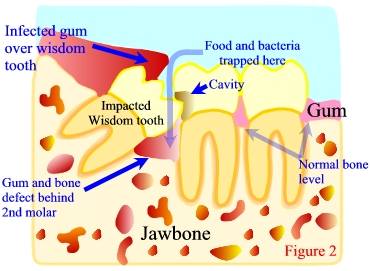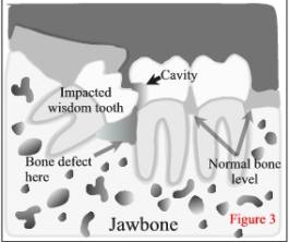 ![]() The Decision to Extract ‘Wisdom Teeth’ When making a decision regarding wisdom teeth extraction for patients, surgeons consider the risks and benefits of ‘doing surgery’ against the risks and benefits of ‘not doing surgery’. Risks of Wisdom Tooth Surgery In considering wisdom tooth extractions and the risks of doing surgery, you should appreciate that though this risk is relatively small, it is not absolutely zero. There are ‘standard risks’ associated with any type of surgery that include the normal pain, swelling, bruising, bleeding, and infection. There are also other specific risks associated with wisdom tooth surgery and these include being left with a numb lip, chin, or tongue (permanently or temporarily), or a problem with the sinus in the upper jaw. These risks, however, are very uncommon and some even quite rare. Your oral and maxillofacial surgeon will discuss all the risks with you on an individual basis. Risks of Not Doing Surgery Alternatively, the other question you should ask yourself is ‘What are the risks of not doing surgery and leaving the wisdom teeth behind? When the wisdom teeth erupt through the gums completely, and are able to reach the proper, healthy position in the jawbone, there is little risk in keeping them or ‘not doing surgery’. These properly positioned wisdom teeth are only slightly more likely to develop cavities or gum disease as compared to the other back-teeth in your mouth. However, when a wisdom tooth is impacted or malpositioned, the tooth and associated gum can be very susceptible to bacterial infection, localized gum disease, and gum abscesses. These problems sometimes occur with very little associated pain or discomfort. In such cases, the gum disease and/or infection will progress ‘silently’ until the tooth in front of the wisdom tooth, along with its supporting gum and bone tissue, is damaged. (see figures 2 and 3)