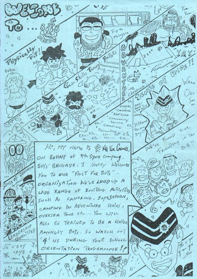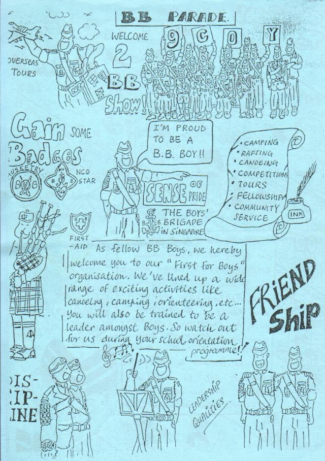 | Introduction Boys’ Brigade 9th Singapore Company, founded by Rev. Cecil McSparron in 1972, at its Sponsoring church located at 2 Dundee Road, Church of the Good Shepherd (COGS). Now parades were held in Westwood Secondary with 9 officers and 18 Boys in 2001. With the strong support by the principal and teachers, the company saw a healthy increase in the number of Boys to 50 in 2003. The Officers' Council headed by Mr. Ivan Ho and Mr. Wong Sai Ho hopes to see the Boys grow in character that is anchored to the objective of the Boys' Brigade. Year 2003 also saw the Officers and Boys of 9th BB involved actively in community projects like Sharity Gift Box and BB Cares. Their first National Bible Quiz participation since 1997 also saw 9th BB coming in as champions in the West District. Now we have 7 Founder’s Mans (the Highest Award a Boy can achieve in the BB) in our company. |