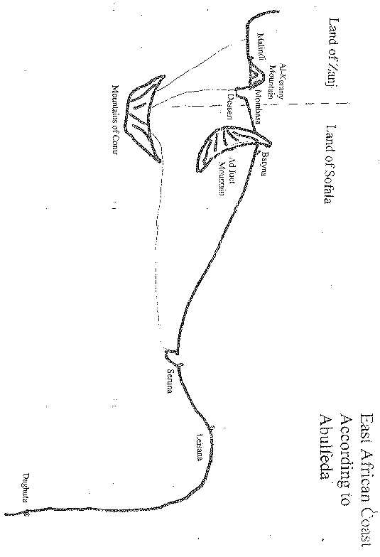 The purport of Ibn Said's remarks is that if we begin at the western end of the land of the Sudan the first thing we find is some of the towns belonging to the Sudan who are naked and unheeded, like animals. He mentions some of their towns, the names of which are non-Arabic and of uncertain pronunciation viz. the town of Manaqlu in longitude 10 deg latitude 4 deg, then Zafu, in longitude 13 deg, latitude 10 deg, zghth, in longitude 24 deg latitude 7 deg; brsnh, in longitude 29 deg, latitude 7 deg, Kusha situated on springs which feed the last river of the second of the Nile lakes, where the longitude is 53 deg and the latitude 2 deg. Beneath it runs the Maqdishu Nil issuing north of the equator. The territory of Qamar lies between the two lakes. The territory of the Akraw and the Qamar mountains, according to what is related after Ptolemy, are in longitude 51 deg 50' , latitude 11 deg. Around these mountains are the settlements of the Qamar after whom they are named and who (says Ibn Said) are related to the Chinese. The notorious fact about them and about most of those who inhabit that land is that they eat any people who fall into their hands. The river of Macdaschou goes up to 66 deg longitude and 11 deg latitude; then it descends on the eastern side of the town of Berbera. There remains between the river and Berbera about one deg. of distance after that the river enters into the sea, east of Macdaschou. He who goes further to the east, reaches the city of Karfuna in the country of Berbera, still further east the city Berma, still further east Hafuni, well known to travelers, inside the continent it stretches for about 100 miles, also into the sea it stretches for 140 miles, in northern direction but also east, with clearly visible, its 7 tops. Malindi is a town of the land of the Zanj, 81.5 degrees long, 2 degrees 50 minutes lat.. West of the town is a great gulf into which flows a river. (is the Sabaki) which comes down from the source many hundreds of miles away in the mountains of Comr (Djebel el-Qomr). (meaning the mountains of the moon). On the banks of this gulf are very large dwellings belonging to the Zanj; the houses of the people of Comr are on the south side. East of Malindi is al-Kerany, the name of a mountain very famous among travelers. this mountain runs out into the sea for a distance of about hundred miles in a north-east direction. At the same time it extends along the continent in a straight line north for a distance of about fifty miles. Among other things which we might say about this mountain are the iron mine which is on the continental side and the magnetic half in the part which is in the sea. At Malindi is the tree of Zendj (the ginger tree) (or at Malindi there are many Zanjian sorcerers). The king of the Zanj lives in Malindi. Between Mombasa and Malindi is about one degree. Mombasa is on the coast. On the west is a gulf along which buildings stand, boats go up river as far as 300 miles. Nearby to the east is the desert (mefasa) which separates the land of the Zanj from Sofala. Among the towns of the country of Sofala is Batyna (or Banyna) (Note this is most probable the Touhna from Idrissi, distorted by a wrong interpretation of the expression : tousamma bi-Touhna; meaning: it is named Touhna). It is situated at the end of a great gulf, away from the equinoctial line, under 2.5 degrees lat., 87 degrees long. According to Ibn Said, on the west of Batyna is Adjued, the name of a mountain which projects into the sea towards the north-east for a distance of 100 miles. The waves of the sea make a great noise here. The people of Sofala live to the east of this mountain: their capital is Seruna (Seyouna), under 99 degrees long. 2.5 lat. (south). The town is build on a large estuary where a river, which rises in the mountain of Comr, flows out. There the king of Sofala resides. Then one arrives at the town of Leirana. Ibn Fathuma, who visited the town, said that it was a seaport where ships put in and whence they set out. The people are Muslims. Leirana is on long. 102 degrees, lat. 0 degrees 30 minutes (south). It is on a great gulf. The town of Daghuta is the last one of the country of Sofala and the furthest of the inhabited part of the continent towards the south. It is on long. 109 degrees, lat.12 degrees, south of the equator. Sofala, According to the canon it is on 50 degrees 3 minutes long. 2 degrees lat, south of the equator. Sofala is in the land of the Zanj. According to the author of the canon, the inhabitants are Muslims. Ibn Said said that their chief means of existence are mining gold and iron, and that they dress in leopard skins. According to Masudi, horses do not reproduce in the land of the Zanj, so that the warriors go on foot or fight from the back of oxen. I have remarked that Sofala is also a place in India. Matan; Ibn Said 51 deg., 13 deg. Thus we find in Ibn Said's book. Ibn Said says; it is level with the angle of the lake called Kuri. South of it is Jimi, the capital of Kanim, and it (Matan itself) is reckoned among the cities of Kanem. This is the lake from which the Nile of Egypt, Maqdishu, and Ghana issue. It is 1,000 miles long. Its eastern end is in longitude 51 deg. its width at the head is 9.5deg, then it gets gradually narrower until its width at the middle is 450 miles and at the tail 360 miles...... Dendema: According to Ibn Said is the town of Demdems at 54 deg 20' by 9.5 deg. According to Ibn-Sayd, Dendema is the country of the Demdems who invaded Nubie and Abyssinie in 617 AH (1220 AD) at the same time as the Tartars invaded Persia. From there it can be said that the Demdem the Tartars of Sudan are. Bedje: According to Athoual at 55 deg longitude and 2 deg latitude. It is outside the first climate, in the south, in the land of Berebra. Do not confuse it with the town in the land of the Bedja, where there is a gold mine of which we already talked. Carfoune: According to Ibn-Sayd, 64.5 deg longitude, 0.20 latitude. It is situ