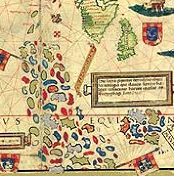 | This map of the Northern part of the Maldives comes from Lopo Homem 1519AD also called the Miller atlas. It was made just after the first voyages of the Portuguese in those areas and partly based on Arab maps bought by them in the countries visited. India and Ceylon are found in the right upper corner. The flag shown everywhere is from Portugal. The cowries (of the type shown Cypraea moneta) were the currency exported from the Maldives to Africa and India. Also is shown a cowry from an early Japanese Encyclopedia. | ||||||||||||||