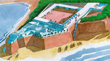 | The famous copper coin of Kilwa that was found in the ruins of Great Zimbabwe. It is inscribed al-Hasan Sulaiman who was Sultan of Kilwa around 1320-1333. This picture can be found on many websites and in many books. And the even more famous reconstruction of the great palace in Kilwa. It was under construction when Ibn Battuta went there or just finished. |