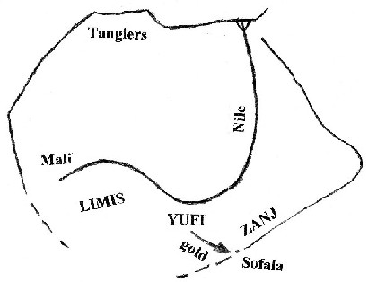The explanation on why Ibn Battuta says the Yufi bring the gold to Sofala. Somewhere in his book he says that the Nile starting in Mali goes to the land of the Limis and from there to the Yufi. He deducts from this that it must be the Yufi that bring the gold. He also describes the Nile as it is seen in the drawing. |