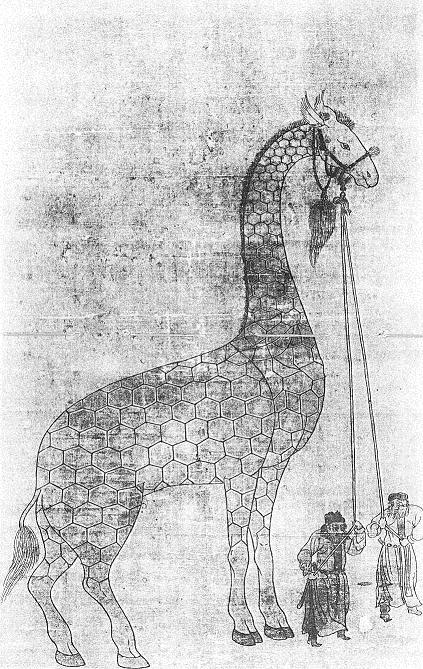| Back to Table of Contents 5 To next page Chinese painting of a giraffe with two Arab guides. (15th cent) ---------------------------- Taken from: Laufer Berthold; The Giraffe in History and Art. Author unknown; painted on silk 54 by 331/3 inch Animal is provided with green headstall, neck adorned with a tassel of horse-hair dyed red and surmounted by metalwork. The tassel is of Chinese make; The two Arabs are clad in long, red girdled gowns and red boots. |