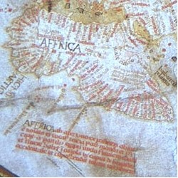 This anonymous mappamundi shows Eastern Africa more accurately than does the Behaim globe. It implies that information is included from Vasco da Gama. It is attributed to Columbus because the marginal notes, in his copy of Cardinal d'Ailly's cosmography show up in this map including one mistake he made in an inscription close to the Red Sea. Columbus and his brother, Bartholomew, were map makers in Seville. I have been unable to find the text written on the map for East Africa. |