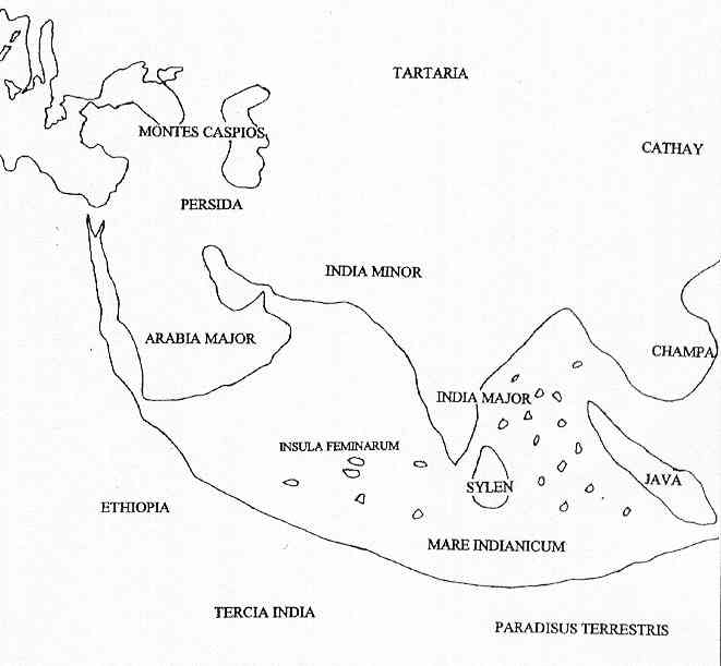| A reconstruction of Friar Jordanus view of the world Taken from one of the several existing translations In this third India (east Africa) there are birds that are called Roc, so big that they easily lift an elephant into the air. I personally met someone who said to have seen one of these birds of which one of its wings had 24 palms long. In this India there are the real unicorns, big as a horse, with a corn on the head only one but very big and pointed, but short and solid and also marrow. This animal it is said is tough in battle that it can kill an elephant. And it can not be caught except by a young virgin. All the parts of this animal are admirable and usable as medicine. There are still other animals all different. There are those who resemble cats of which the sweat has such a good smell that it smells better then anything else in the world, it gets collected as follows; when it sweats it rubs a tree the sweat sticks to the tree, dries and people come to harvest and take it away......... There are snakes, some have horns, other precious stones. The people of this land are very black, with a big belly, but small, with big lips, flat nosed, protruding and ugly face. In general they walk naked. I've seen many of them. They catch terrible animals, like lions and leopards as well as terrible snakes. They are harder then the wild animals. In this India one finds amber, which is like wood it also mummifies excessively and is called marine-gem, or precious thing from the sea. There are a certain kind of animals who resemble a donkey, striped all over with black and white in such a way that one stripe is black and the following white. Those animals are so beautiful that it is marvelous. (In his section dealing with India minor = Pakistan + N. India) There is also another tree of a different variety, who like that one ( the coconut tree) gives always a white liquor as nice to drink as that one, the tree is called tari (or tali) (palm-wine tree) (this tree is indigenous to Africa and imported and cultivated in India. According to Hoernle this is the oldest mention of the tree in India) |