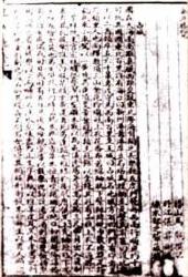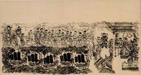 | On top: A restored copy of the illustration of Zheng He's visits to the West on the flyleaf of the book "Heavenly Princess Classics" in 1420. This invaluable picture is the earliest pictorial record of Zheng He treasure-ships Left: a page from the Manuscript: it shows the section on Champa; a kingdom in Vietnam. |