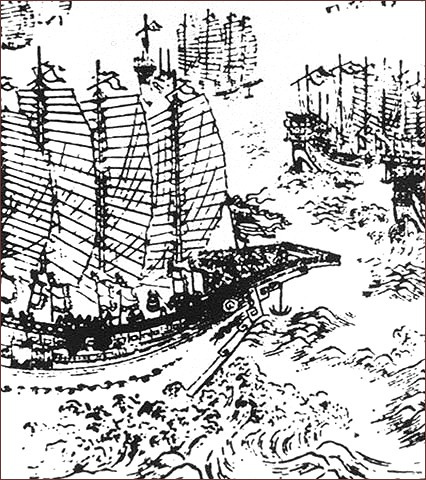 | Zheng He's ships, as depicted in a Chinese woodblock print thought to date to the early 17th century. | |||||||||||||||||||||||||