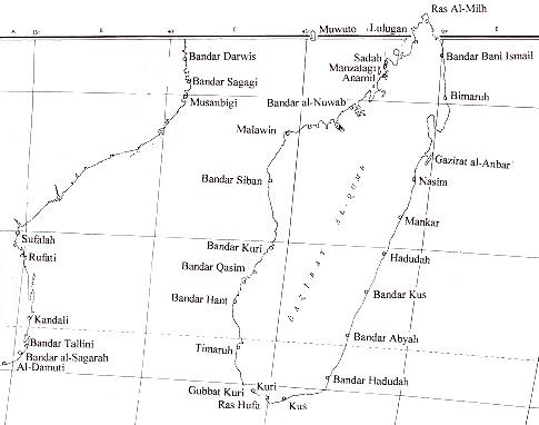 Chapter VII verses 135 to 144: (strangely enough no information is given for the traffic between Madagascar and the African mainland; only what courses to follow between 7 main harbors in Madagascar and the islands of Tiri-Raga.) (Paragraph with title:)The harbors from which to leave at the coast of Madagascar When the coast of (east) appear of Madagascar, your intension is to get through to the islands (of the east) Put the course to Tiri-Raga (=one of the Mascarene) following (the rumb of) Achernar, starting from a latitude equal to that of Sa'da; this is how my informer told me. Then the harbor Bani-Ismail, go my friend, to the east following ( the rumb of ) Canope From Mankar, take the course east on (the rumb of) Achernar and Tiri-Raga appears surely at your horizon. From Haduda, with course east on (the rumb of) Scorpion you will get there also, you who are broken from the routine. But your route will be on (the rumb of) Altair (=strait east) if you sail from the accesses to the harbor of Kus (Bandar Kus), don't stop from learning. You reach, brother the island Tira-Riga from Bandar Abya (or Abaya) that is certain, When keeping, friend, course to the easr on (the rumb of) Arcturus. As well you reach from Kouri, when taking course to the east on (the rumb of) Capella. See here what are all the routes (on the east) of Madagascar; it is up to you to understand well my verses. If it were not, my brother, because of differences in the reports of my informers, we would have listed the double amount of noteworthy places. (Paragraph with title:) The harbors from which to leave at the coast of Berbera (I do not possess this text.) Chapter VIII Knowledge of the distances between the coast of Arabia and the ones of India, from the place where the height of the pole star 5 fingers is, to the place where it is 12 fingers. Enumerating the distances in zam between the harbors situated on 4 principal latitudes comparing with what has been written about it; and starting from those distances all other distances in the sea can be calculated. Tome1 p110 R l.3 of the Ms 2292 From Pemba to Karmadnua it is 150 zam and even more according to another estimation; de Karmadnua to Sund of java there are 130 zam making the total between Java and Pemba 300 minus 20. Tome1 p111 V l.2 of the Ms 2292 Java and Pemba also called Aithriqari and Karm Danua and the harbor of Java are at 1 finger of the pole star. Madjid lets us know that he was unable to obtain the exact distances for China and Madagascar. (This in a list of distances in zam between different harbors) Chapter IX: The determination of the height of the Polar star, the two Guards, and the Wagon at the moment of the culmination of ? of the Lion, for all the known capes situated in the ocean and on the northern site; that is to say the Indian sea, the one of Siam, of Arabia, and of the Sawahil (In a table of altitudes of the polar star in fingers above the horizon decreasing from 11 to 1 finger) 4 fingers; Gardafun (and several places in Asia). (In a table of altitudes of the two Guards in fingers above the horizon decreasing from 7 to 1 finger) 5 fingers; Barawa (and many others in Asia) 3 fingers; Kitawa etc.. 2 fingers; Munbasa, Zarrin (Seychelles lit. meaning sisters) (In a table of altitudes of the wagon in fingers above the horizon decreasing from 12 to 1 finger. Here I give the whole table as there are many places here that interest us) Chapter IX section 69 verses 50-79( Big Bear = the Wagon) 12 fingers: Surabaya, the island Fali, Java, Manfiyya 11 fingers: al-Harba, Huriyya, cap al-Milh, Faydin, Sasi-Timur, Kilwa, Angaziga,(=Grand Comore); Hanzuwani,(=Anjouan); Mulali (=Moheli), Dumuni. 10 fingers: the islands Timur, al-Qumr, the harbor Bani Isma'il, Lulugan (=Langani), al-Ahwar, Sofala 9 fingers: Bimaru (=Vohemar), Anamil, the harbor Darwis, Manzilagi (=old Masselage), Sa'da. 8 fingers: The island Anbar, the harbor Sagagi, Musanbigi, the harbor al-Nuwab. 7 fingers: Nasim, Malawin 6 fingers: Sofala, the harbor Si'ban, Mankar. 5 fingers: the harbor Haduda, the harbor Kuri, Rufati. 4 fingers: the harbor Kus, the harbor Qasim, Kandali. 3 fingers: the harbor Hant, the harbor Tallini, Abya, Tiri-Raga. 2 fingers: Haduda, Timaruh. 1 finger: the harbor Kus, the bay of Kuri, the harbor al-Sagara fol, 112a; section 9 .... The harbor of al-Shadjara (Lorenzo Marques?)which is well known lies one isba from the na'sh. The learned give this as the position of this port. There are no others having a name..... And there is nothing south of these lands, for it is there the land of Zeng ends and there is the strait (that leads) to the land of the west and of the Franks. There is nothing to the south (of Africa) except reefs and darkness which the creator (alone) knows. Some say that there are islands and that the extreme end of the coast is 5 isba (18deg 21 min S) - O thou, the best informed. But the stories of the authorities do not agree. We ask Allah to pardon our errors. |