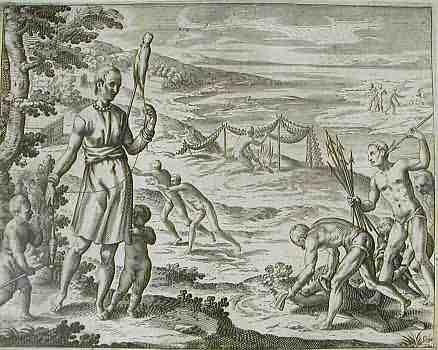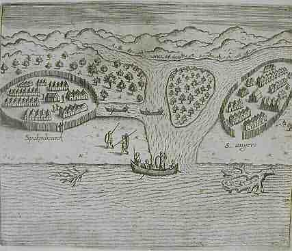 On this island we came across two villages, which we named Spakenburg and St. Angela. Both villages were enclosed by poles, stuck in the ground with only two entrances, one to the land, the other to the water. Within these enclosures were about two-hundred dwellings supported on wooden poles to prevent vermin from getting inside. In the middle of these dwellings is a large house for the chieftain, where a guard is permanently on duty. At Spackenburg we traded with the natives and met the chieftain, who was drunk and who invited us to sample their brew, which was made of rice and honey and served in an ox's horn. There was also an inn in the village where our shipmates sat drinking and making merry with the natives. |