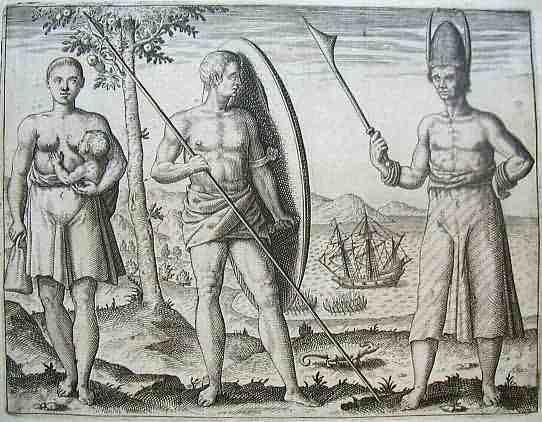 While we were moored off the island of Santa Maria, a galliot arrived with the king of the island aboard. His name was Philo and he had in his hand a strange rod, as shown in this picture. His garment was a kind of striped cotton shirt and on his head he wore a pointed helmet, rather like a bishop's mitre. It was beautifully decorated and on either side were horns, half a yard long, with little pointed tassels. He, and his entourage of twenty-five aristocrats, looked at our ship with great admiration. In this illustration is also shown a native from the cove of the island Tangil, with his weapon and a great wooden shield, which had at the top a long slit cut out, through which he could see and feel safe. Their lances are two fathoms in length and have a wide, iron spearhead. The women crop their hair and wear it short as the men do and they suckle their children as shown here. |
