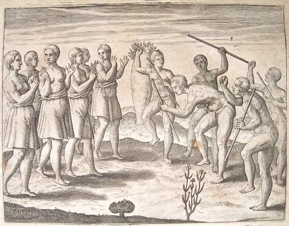 While we Dutchmen were in Madagascar we observed the following dance, performed by the poorest people. The men went naked, except for a small mat, woven from tree-bark. First, about twenty men assemble with their weapons in their hands, followed by the women. After they had all gathered, the men stepped back, leapt into the air, swinging their feet out behind them like angry horses, so that whomsoever stood behind them would be in great danger of being kicked. Meanwhile, the women, standing opposite, acted as their musicians by clapping their hands, singing sweetly and stamping their feet in rhythm. It was a very strange performance to observe. |