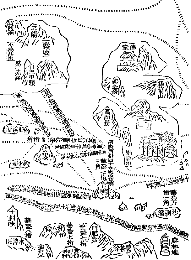 (Brava) Hua Kai 8 fingers Man-pa-sa Men-fei-ch'ih Ma-lin-ti (1 deg 36' N) (Mombasa) (Mafia island) (Mozambique) Mu-lu-wang Hua Kai 7 fingers Hua Kai 7 fingers (Brava) Ch'i-ta-erh Che-chi-la Ko-ta-kan (Ras Kitao?) Ha-tse-la (Quitangonha island) (Gezira,Gezira?) ------------------------------------------------------------------------------------------------------------------------ Note: Hua Kai is a star used for navigation; example; In Mombasa is Hua Kai at its highest point 7 fingers above the horizont. It is not known which star is used. The Pei ch'en star which is also used is the North star. Sailing Directions On the map are also two important sailing directions: The first one starts from Male (Maldives) to Mogadishu; it reads: From Kuan hsu liu (Male Island) steer 255 deg-270 deg ; after 150 watches the ship makes Mu-ku-tu (Mogadishu). The second one is the one which winds along the east coast of Africa. It reads; (we start reading from the south) (When you are ) in ( the latitude where the altitude of the ) Hua kai star (is) less than 5 fingers ( 3deg 12' S) (and) are going to (the latitude where the altitude of the ) Pei ch'en star (is) 4 fingers (6deg 25' N), you set (your course) upon the Tou (star) (Alpha, Beta, Gamma, Delta of Ursa Major). When mountains appear, you set a compass (-course) of 15 deg-30 deg. (After) 65 watches the ship reaches Ko-erh-te-feng (Guardafui), (which is) Ha-fu-erh-yu (Hafun) . (When you are ) in (the latitude where) the angle is 3 fingers (4 deg 49' N), mountains appear. Going to (the latitude where the altitude of Pei ch'en is) 6 fingers 2 quarters (10 deg 26' N) (you go) straight around that place on (a course of ) 60 deg...... Again (when you are ) in (the latitude where the altitude is ) 6 fingers 2 quarters, there will be mountains to landward. Translation taken out : Ma Huan : The overall survey of the ocean's shores (1433) translated by Feng Ch'eng-Chun 1970 Note that the big island is Ceylon; the small islands in the middle the Maldives and the land in the upper left corner South India. |