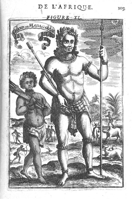 | Giant from Madagascar (1683) by Mallet. View of the countryside and its inhabitants. It depicts a giant and his normal sized companion in the foreground, as well as a number of other natives who appear to be engaged in various activities such as hunting. The text on the reverse tells about the customs of these mythical giants of Madagascar. |