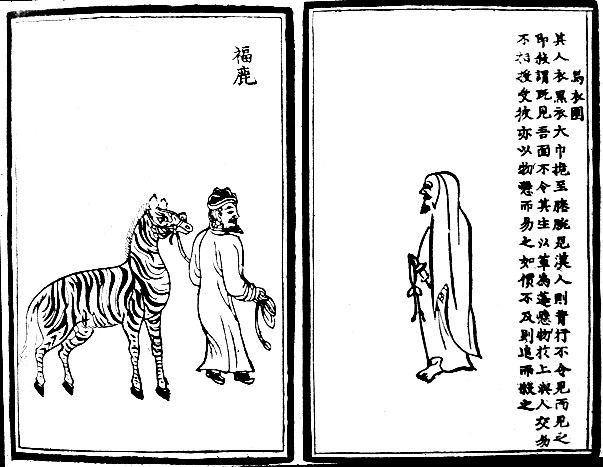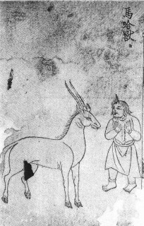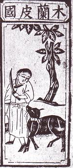 | One more picture of this book. It represents a man with a sword and a sheep. The title is Mu-lan-p'i-kuo the Muslim Maghrib. The name is a transliteration of Murabit a dynasty ruling in Marocco and Spain. Some (very occasional) author says it is a place situated in East Africa. (drawing found in G. Sarton: Introduction to the History of science) | |||||||||||||||||||||||||||