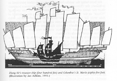 When Ma Ho was ten years old (around 1381), he was captured along with other children when the Chinese army invaded Yunan to take control over the region. At the age of 13 he was castrated, as were other young prisoners, and he was placed as a servant in the household of the Chinese Emperor's fourth son (out of twenty-six total sons), Prince Zhu Di. Later his name was changed to Cheng Ho by the prince. Cheng Ho, who was said to have been seven feet tall, was given greater power when Zhu Di (or Chu Ti) became emperor in 1402. The new emperor took the name Young Lo . One year later, Young Lo appointed Cheng Ho admiral and ordered him to oversee the construction of a Treasure Fleet to explore the seas surrounding China. The first three voyages explored Asia. The fourth till the seventh also go to East Africa. When emperor Young Lo died in 1424 and his son Zhu Gaozhi became emperor. He canceled the voyages of the Treasure Fleets. Cheng Ho was appointed military commander of Nanjing. Zheng He flag "treasure ship" is four hundred feet long - much larger than Columbus's. In the drawing below, the two flagships are superimposed to give a clear idea of the relative size of these two ships. Admiral Zheng Ho was not the first to travel from China to Africa. The Quanzhou wreck from 150 years earlier.The best archeological evidence available comes from the wreck buried in muck at Houzhou. Houzhou lies about six miles from Quanzhou, an important Song trading port in what is now Fujian Province. The ship was about 114 feet long by 32 feet wide, with a displacement of roughly 375 tons. The archeologists found more than 500 copper coins associated with the wreck, 70 of which were minted during the Southern Song period (ca. 1127-1279), with the latest ones dating to 1272. The ship probably sank soon after that date.Associated with the ship remains were about 5,000 pounds of fragrant wood, probably from either mainland or island Southeast Asia, and assorted materials such as cowry shells, ambergris, cinnabar, betel nut, pepper, and tortoiseshell, all attributed to sources in Somalia. These archeological associations could just as easily have resulted from tramping -- that is, ships not making point-to-point voyages but taking on and trading cargo at various ports along the way -- |