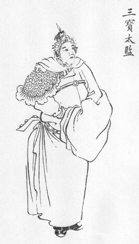 | Left: A drawing of Cheng He out of one of the editions of Luo Maodengs story. | ||||||