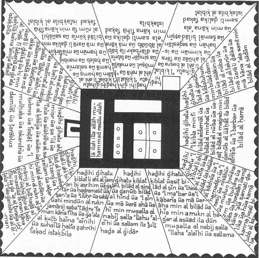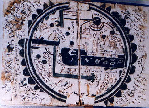 | Kibla map from Ibn al Wardi. This kind of map takes the Kaba as the centre and shows from there on all countries. Zang here is found in the text in the lower left corner. | |||||||||||||||||||||||||