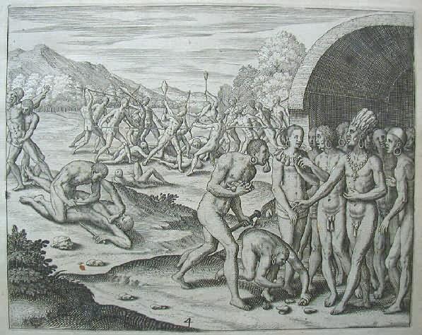 | Several accounts speak of emasculating the slain enemies as a practice in the Horn of Africa. This drawing made about a hundred years after the arrival of the Portuguese in East Africa speaks about it being a way more common practice. (The picture shown here and the text in red do not belong to the manuscript of Zaera Yacob. It belongs to Theodore de Bry of Frankfurt who made it 1598-1603. And they represent some of the earliest drawings of East Africa from Europe. Added here as illustration only. The Bantu, who have chiefs in every area, often fight each other. The winners of these battles cut off the genitalia of their victims, whether they are alive or dead. After the harvest of amputated genitalia is dried, the victors offer them to their chief by putting them in their mouths and then spitting them out before him. The chief then has them gathered up and strung on a necklace like beads as a distinguished gift for his bride. It might be compared with the honor of wearing the medal of the Golden Fleece back home. Many of these people are also cannibals, while others sell their captives as slaves to the Portuguese. ---------------------------------------------------------------------------------------------------------------- |