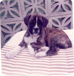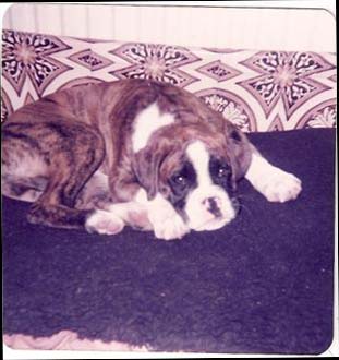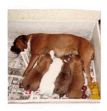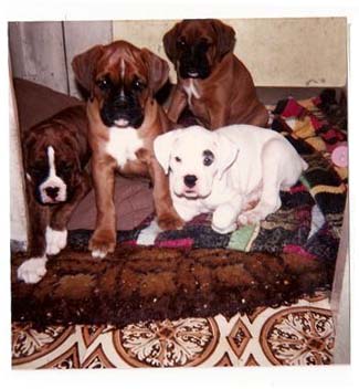 | Holly was mated for a 2nd time to a US import. She only had 3 pups. We kept a dog this time, but we had to say goodbye to him at 2 1/2 years as he was having uncontrollable seizures. So, with the vet's advice we mated Pippa for a 3rd time to Alisa Argosy of Rahdervons, a Gremlin Summer Storm son. She had a C section and 8 pups. We lost one , and this time we kept 2 bitches Carla (on the left below) and Tiffany 9on the right below). Carla was latter mated to Tyegarth Boski we ran on again 2 bitches, Diceulon Go For Broke and Diceulon Miah Jon. Go for broke went up north at 7 months old and was the foundation bitch of the Mulbrae kennels. We kept Miah Jon ( Leah). |