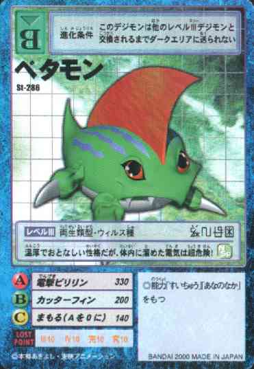 | Unless he is replaced with another Rookie Digimon, he cannot be sent to the Dark Area. | When he gets angry he lets out an electrical attack that shocks everyone around him, both friend and foe! | Has the powers of "underwater" and "fighting" |