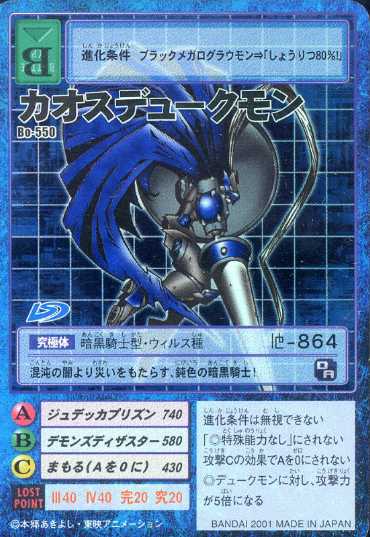 and He cannot lose his special powers and He is not affected by "A goes to 0" and Attack quintuples against Dukemon. |