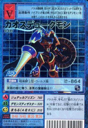 | At the beginning of the battle, if you are a Hybrid Digimon who evolves using either the Spirits of Darkness or Light, discard one Dark Area Digimon from your hand and place this card in the Digimon Box. | A lance bearing evil knight dancing in the darkness of the abyss!! | During the battle if you discard a Spirit of Darkness H from your hand, you will no longer be affected by the C attack's "A goes to 0" and your attack strength triples. |