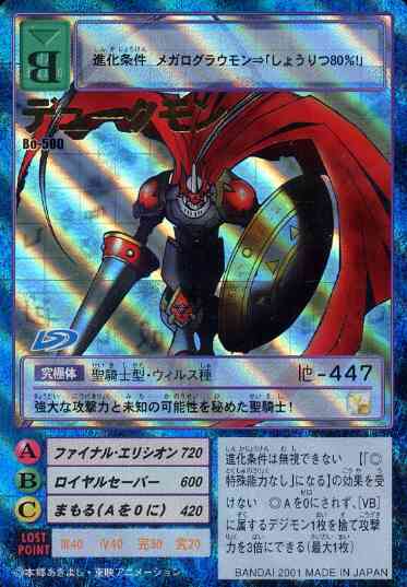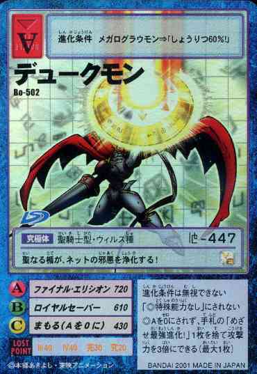 and He cannot lose his special powers and He is not affected by "A goes to 0" and If you discard one Virus Busters Digimon from your hand, attack triples (max. 1 card) |