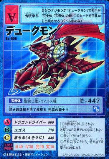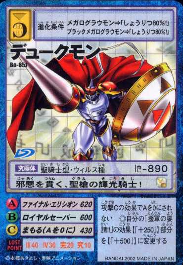 | If your Digimon is Dukemon and the opponent is an Ultimate or Mega, you may take this card from your hand and place it in the Digimon Box (only during the battle). | A Lightning Knight, he races through the sky on the crimson Grani!! |