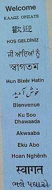 bezeichnete Rasen, mit deutschem Weidel-Gras bepflanzt wurde (wie übrigens die meisten Fußball- und Tennisplätze in England), dann würden sie das sicher nicht mehr betreten - die Demütigung wäre einfach zu groß, denn die Deutschen hassen hassen sie noch immer aus ganzem Herzen, genau wie die Japaner und die Italiener. Woher Dikigoros das wissen will? Nein, selbstredend nicht aus öffentlichen Verlautbarungen irgendwelcher Politiker - die würden sich das denn doch verkneifen -, sondern aus Kleinigkeiten, in denen das ganz offen und beinahe offiziell zum Ausdruck kommt. Wann wart Ihr, liebe Fußballfans, zuletzt zu einem Europapokalspiel in London? Und was habt Ihr Euch bei dieser Gelegenheit noch angeschaut außer dem Stadion? Nein, Dikigoros meint nicht die so genannten "Sehenswürdigkeiten" für Touristen und auch nicht das Nachtleben. Aber es könnte doch sein, daß Ihr Euch mal etwas näher in der Historie Eures Lieblingssports umgesehen habt. Früher, d.h. bevor diverse Vereine von arabischen Ölscheichs und von der russischen Mafia zu Zwecken der Geldwäsche aufgekauft wurden, gab es nämlich auf dem Boden Groß-Londons - jenes Molochs, den die Kommunalreform von 1965 schuf - noch mehr Fußballvereine als nur Arsenal, Chelsea und Fulham. Zum Beispiel West Ham United (das, anders als der Name vermuten läßt, im Osten Londons beheimatet ist; im Westen spielen Brentford, Charlton Athletics, Chelsea, Crystal Palace, Fulham und die Queenspark Rangers), das einige der berühmtesten Weltmeister von 1966 stellte, oder die "[Hot-]Spurs" aus Tottenham. (Keiner dieser drei Namen hat übrigens etwas mit Schinken zu tun; "Hamme" ist vielmehr das alt-sächsische Wort für den Platz in der Biegung eines Flusses, wo man bevorzugt befestigte Plätze anlegte, weil die dann schon von 2-3 Seiten geschützt waren; daher kommt auch der Name Hamburg - dem einzigen Ort auf dem Kontinent, wo es mehr Fußballvereine gab als in London.) Wart Ihr mal in Tottenham, im Norden Londons? Wenn Ihr dort ankommt, werdet Ihr auf wahrhaft polyglotte Art und Weise willkommen geheißen. Dikigoros möchte wetten, daß nur wenige Besucher all die Schriften lesen (geschweige denn all die Sprachen verstehen) können, die auf dem Schild, das er Euch hier abgebildet hat, den Besucher willkommen heißen. (Was keine Schande ist - er selber kann es auch nicht; aber er kann sie immerhin zuordnen. Für Neugierige: es sind 5 indische - darunter Urdu -, 4 afrikanische - darunter Französisch -, Griechisch und Türkisch, Chinesisch und Vietnamesisch.) Das ist aber auch gar nicht so wichtig, jedenfalls nicht so wichtig wie das, was jeder auch ohne umfangreiche Fremdsprachen-Kenntnisse ohne weiteres erkennen kann, nämlich welche Sprachen fehlen: Deutsch, Italienisch und Japanisch! (Und dem Vernehmen nach soll es Orte nördlich von London geben, wo es noch schlimmerfarbiger zugeht - dort würde sich Dikigoros als nicht-muslimischer Weißer allerdings nicht mehr ohne weiteres hin trauen - muß ja auch nicht sein, sollen die Limeys doch im eigenen Saft schmoren und die Multi-Kulti-Suppe, die sie sich eingebrockt haben, selber auslöffeln :-)