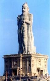 "Timeo Danaos et dona ferentes [ich fürchte die Griechen, auch wenn sie Geschenke bringen]" - diesen Satz legten die Römer einem vorsichtigen Troianer in den Mund. Es half nichts, seine Landsleute nahmen das Danaer-Geschenk an, und Troia ging verloren (aber das ist eine andere Geschichte). Die Hindūs haben Kashmīr verloren - an die Muslime -, aber sie haben auch Kanyākumārī verloren - an wen? An den kommerziellen Tourismus mit all seinem Nepp? Ach was, nach allem, was Dikigoros an anderen "heiligen" Orten, von Warānsī bis Haridwār, erlebt hat, könnte ihn das doch nicht mehr schocken. Nein, auch nicht der 1970 erbaute Tempel auf dem linken Inselchen, der gar kein Mãdir ist, sondern nur ein "Mãdapan", ein "Memorial", wie es auf Englisch heißt, also eine Andachtsstätte nicht für Götter, sondern für Menschen. Dieses ist dem Swāmī Wiwekānand gewidmet, einem Religionsfilosofen aus Bengalen, der nicht nur den indischen Subkontinent vom äußersten Norden bis zum äußersten Süden predigend durchwanderte, sondern auch in die USA reiste, genauer gesagt nach Chicago, um seinen Glauben zu verkünden. Ein reichlich merkwürdiger Glaube war das, in dessen Mittelpunkt Krishn stand, und der dem Westen ein ziemlich verzerrtes Bild von "der" indischen Religion vermittelte - aber das mag ja noch angehen, jedenfalls stand er für ganz Indien. Aber was sich die Regierung Tamil Nādus jetzt auf dem rechten Inselchen geleistet hat, mit eben jenem 40 m (!) hohen Klotz, das schlägt dem indischen Faß den gemeinsamen Boden aus, denn das ist nicht nur eine Absage, sondern geradezu eine Kampfansage an die gemeinsamen kulturellen und geistigen Grundlagen - die doch das letzte sind, was die in allen anderen Punkten so unterschiedlichen Völker Indiens noch zusammen hält. Die Statue stellt niemand anderen dar als den Dichter Thiruwalluwar. Nie gehört? Natürlich nicht. Von Wālmiki vielleicht, auch von seinem Rāmāyan, oder auch vom Mahābhārat - aber wer oder was ist Tirukkural? Womit soll Dikigoros - der doch sonst um Parallelen (fast) nie verlegen ist - das vergleichen? Nehmen wir mal an, ein indischer Tourist (oder Greencard-holder :-) kommt nach Deutschland, genauer gesagt in die Hightec-Schmiede München. Er hat sicher schon mal von Max Müller gehört (das unterscheidet ihn von Euch, liebe deutsche Leser, wenn Ihr nicht gerade Indologen seid - und womöglich selbst dann :-), wohl auch schon mal von Goethe und Schiller, und vielleicht sogar vom Nibelungenlied. Und nun will er die berühmte Frauenkirche besichtigen. Doch als er sich der Münchner City nähert, oh Schreck, sieht er plötzlich etwas ganz anderes: Auf einer Verkehrsinsel im Stadtkern, zehnmal so hoch wie die Frauenkirche, steht ein Denkmal auf - Ludwig Ganghofer, den großen bayrischen Dichterfürsten, und in der darunter gelegenen Gedenkstätte kann man nachlesen, daß "Der Herrgottschnitzer von Oberammergau" (oder "Das Schweigen im Walde" :-) das Nationalepos Bayerns sei. Gewiß - das Tirukkural ist um einiges umfangreicher (und um fast zwei Jahrtausende älter - was in Indien noch immer ein wichtiges Argument ist) als das bedeutendste Drama Ganghofers, und jeder brave Tamile wäre ob eines solchen Vergleiches zutiefst beleidigt; aber im Kern trifft es den Nagel auf den Kopf.
